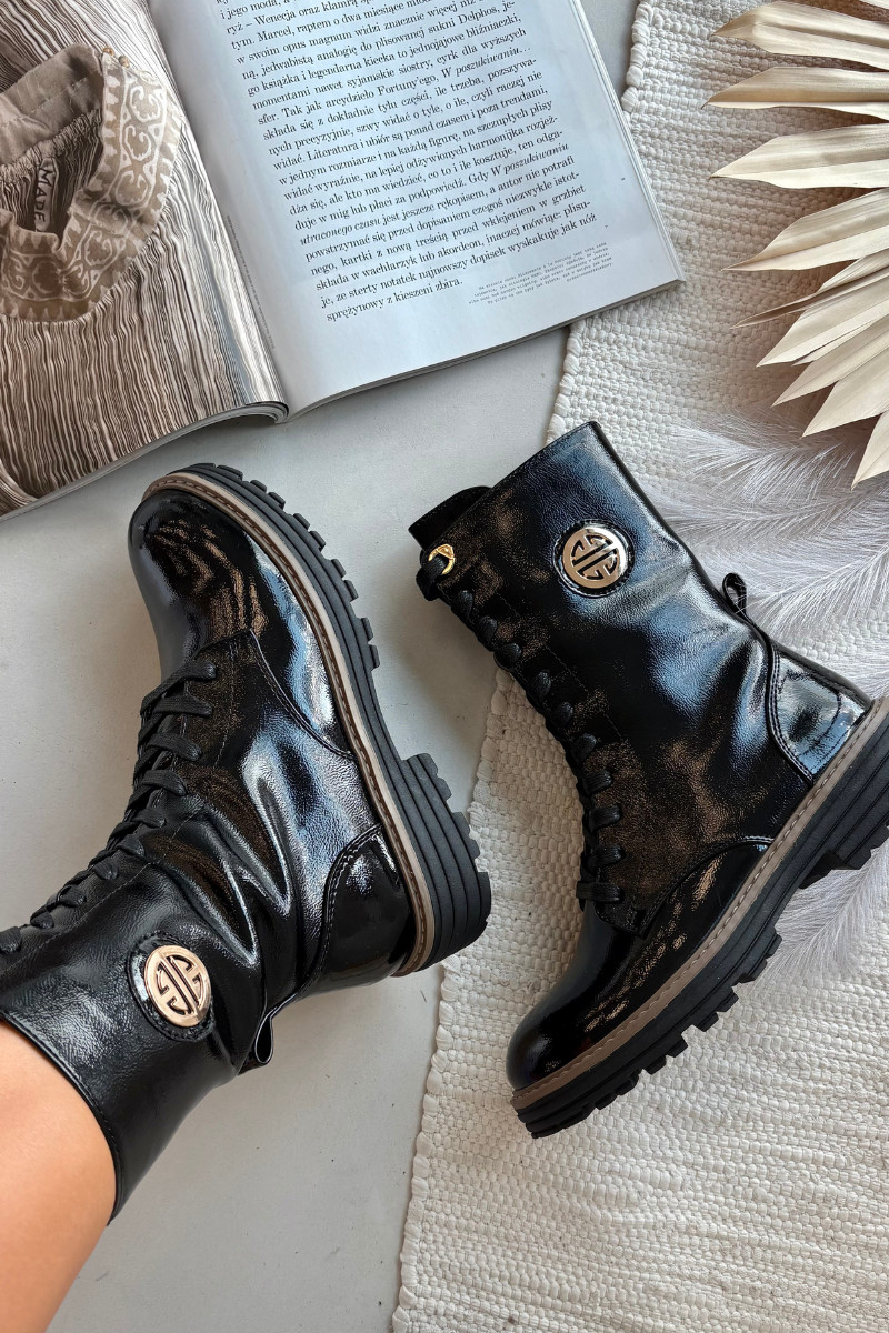 con efecto barniz botines de trabajo Femenino Ze color doradom Detalem calentamiento de color negro Dorialine
