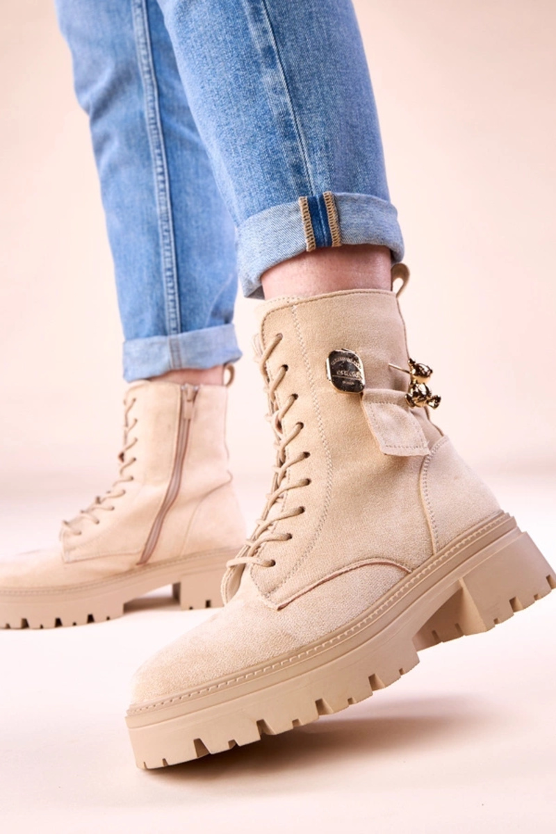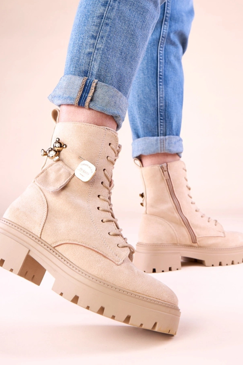 Botines de mujer color arena con un osito dorado Messey