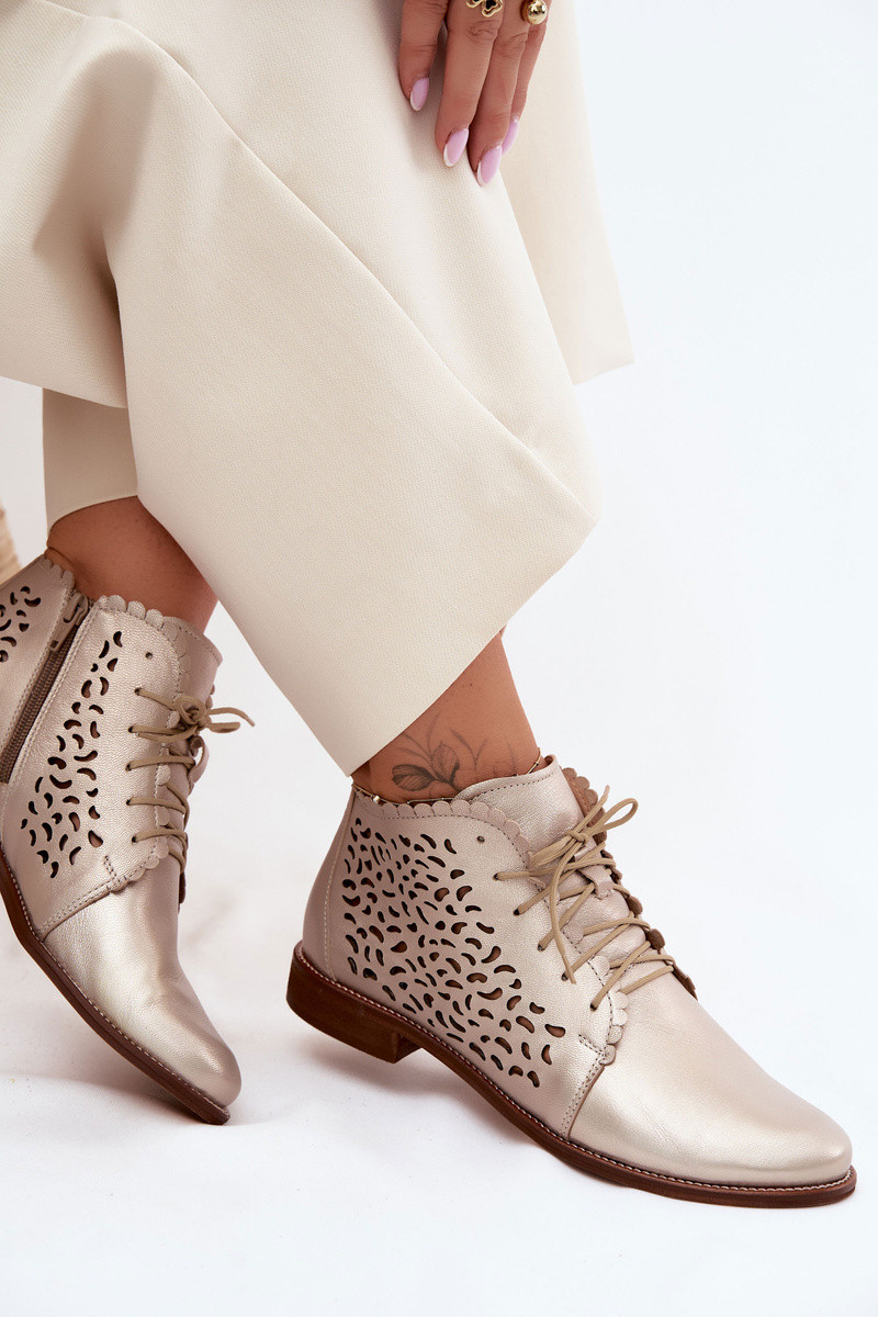 Botines de cuero dorados perforados elegantes con tacones anchos Zazoo 4078