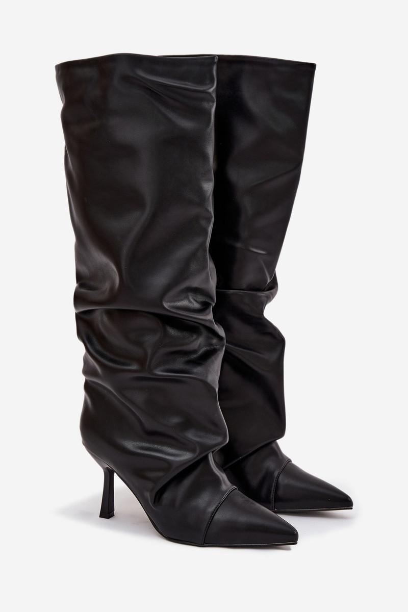 Botas largas de mujer sin cierre, calentitas, con tacones delgados y volantes, negras Angelica