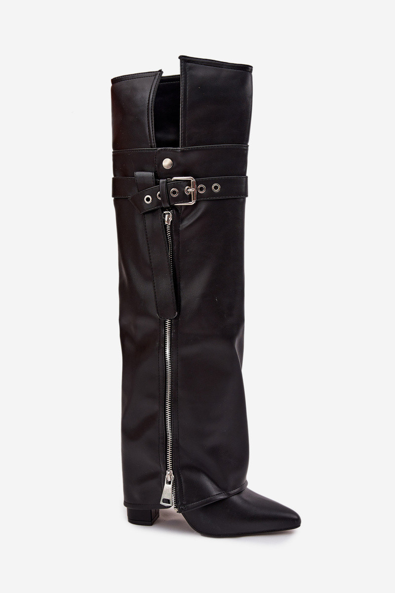 Botas largas de mujer de color negro con tacones, correas, hebillas y cremallera plateada