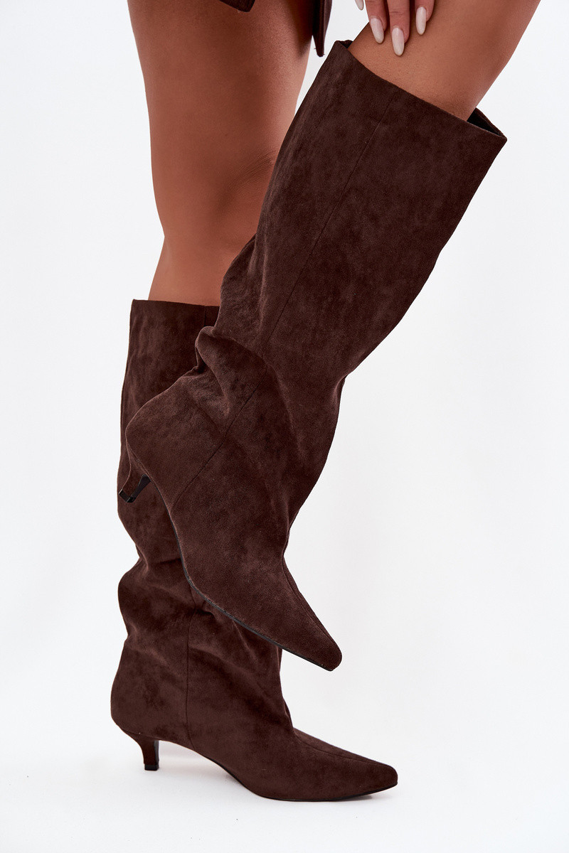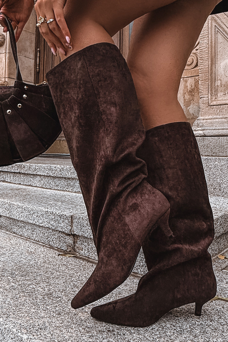 Botas largas de mujer con tacones de ante sintético color chocolate Pheona
