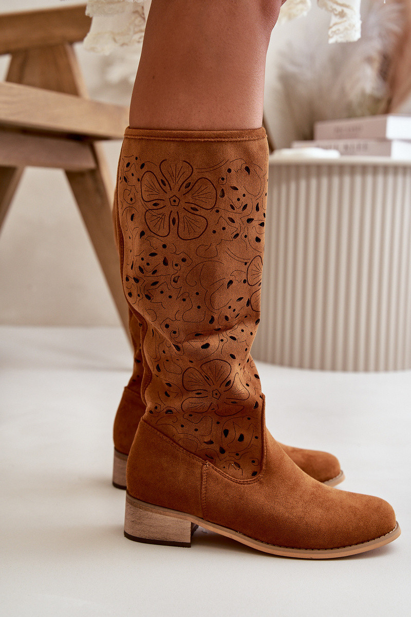 Botas de caña alta para mujer con elementos de calado y tacón bajo de ante sintético con cierre de cremallera color marrón Orchi