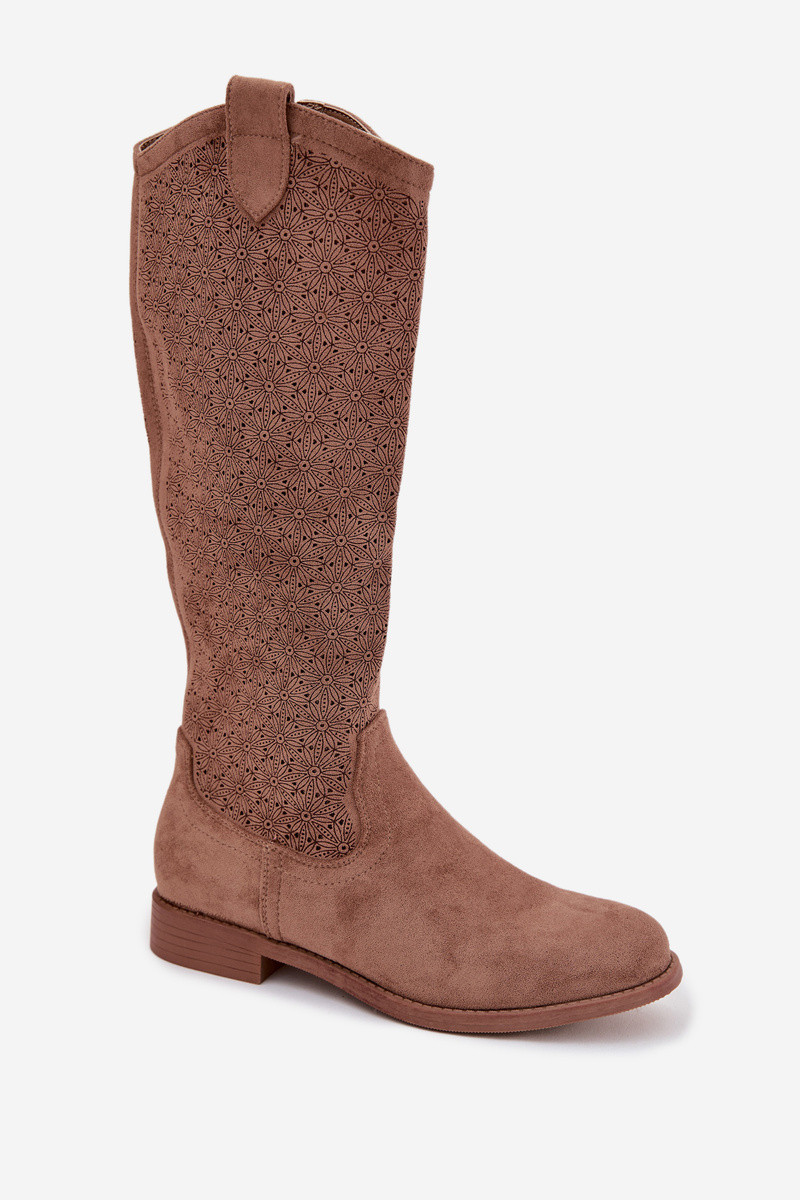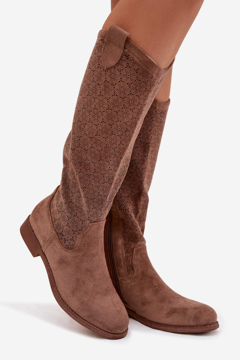 Botas largas para mujer con elementos de encaje y tacones anchos S.Barski HY61-8022 color marrón