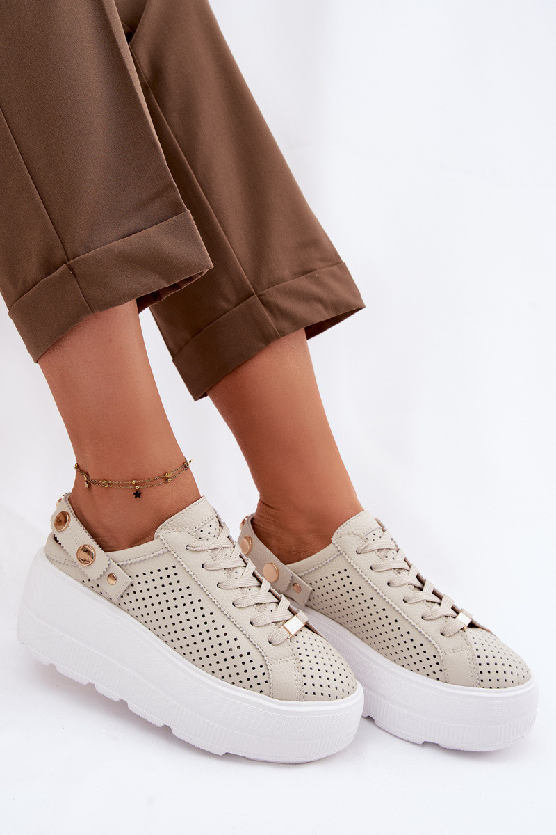 Zapatillas deportivas de cuero con detalles calados para mujeres con plataforma y tiras D&A LR61-7088 color arena