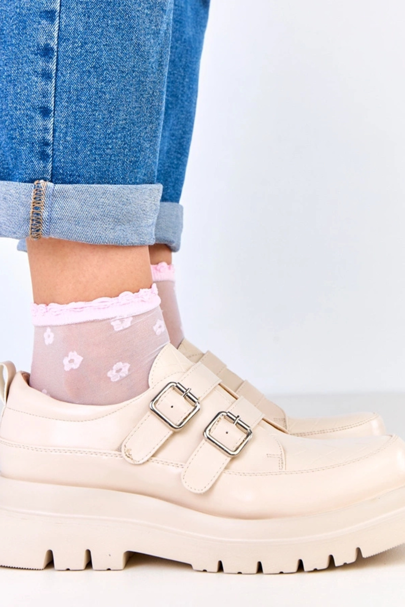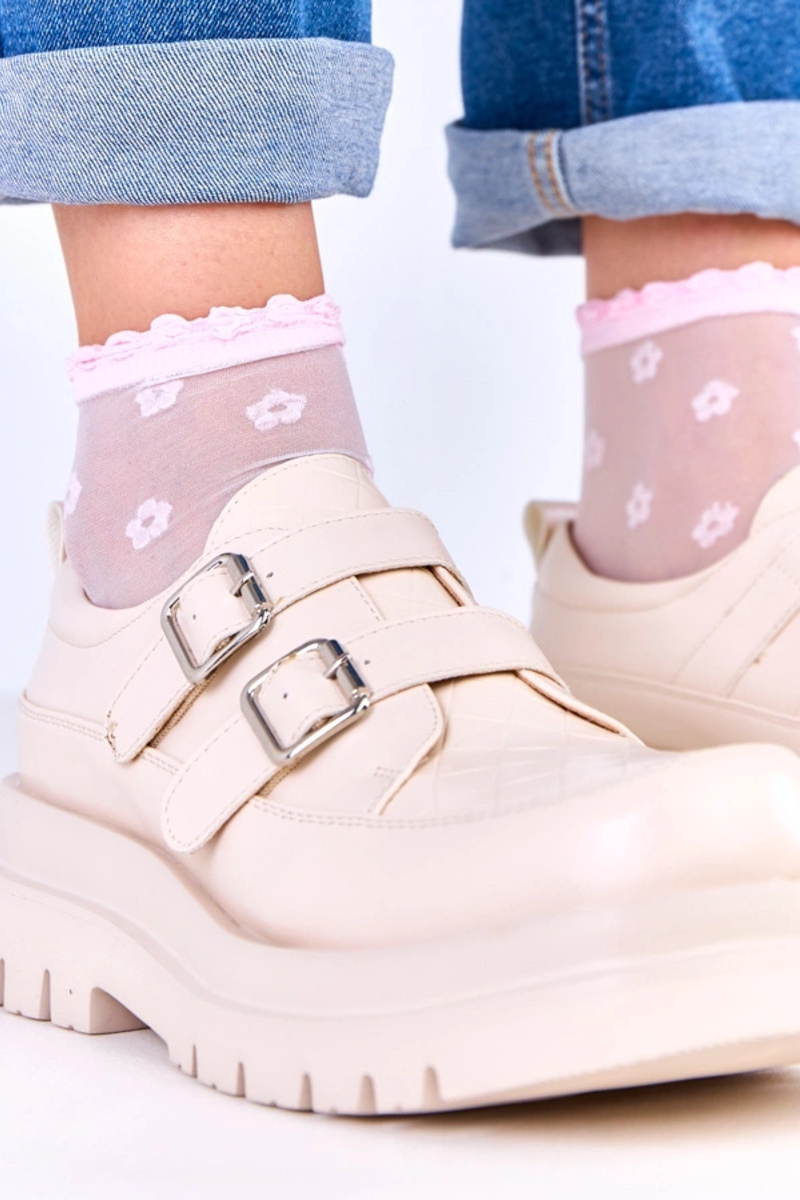 Botines color arena sobre suela masiva, decorados con hebillas, Juke