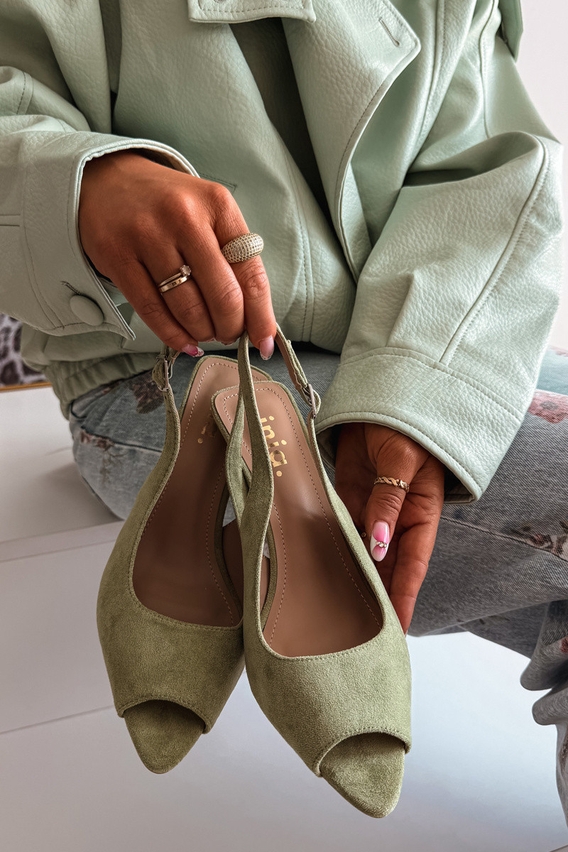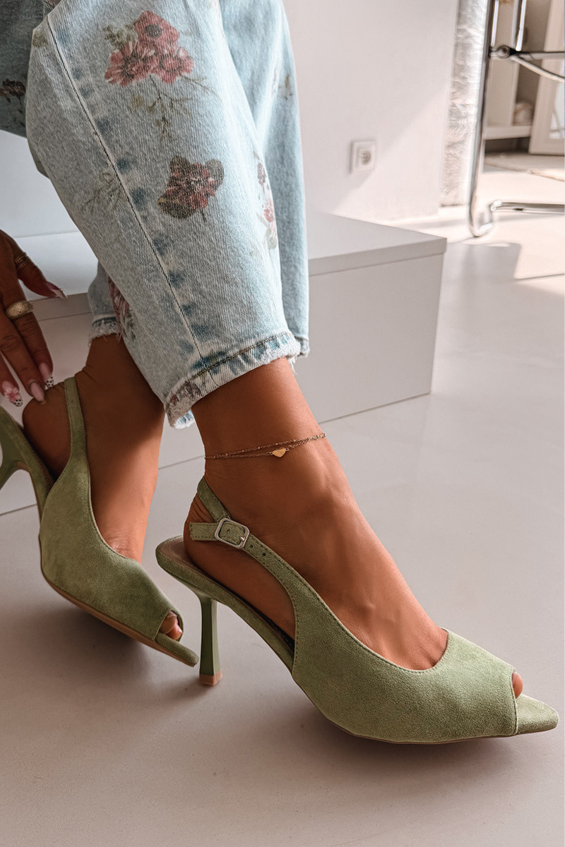 Sandalias de mujer con tacones finos de gamuza ecológicaoAe color verde Sevina