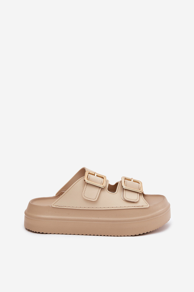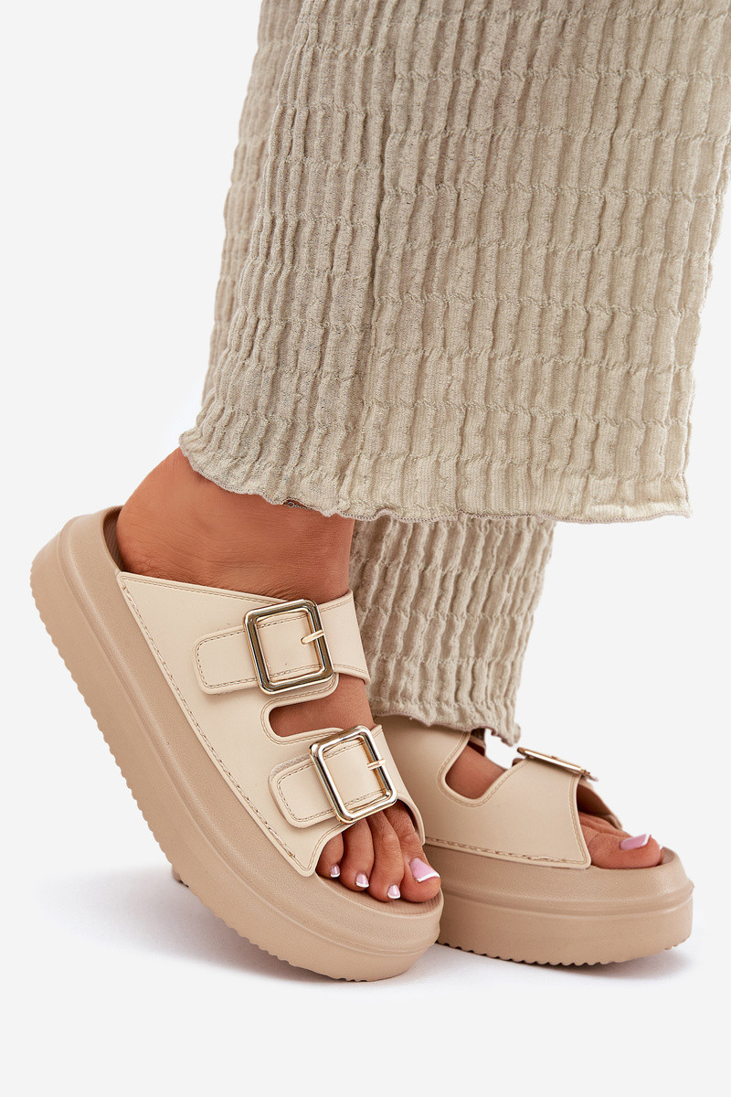 Zapatillas de mujer con plataforma y hebillas doradas, color arena