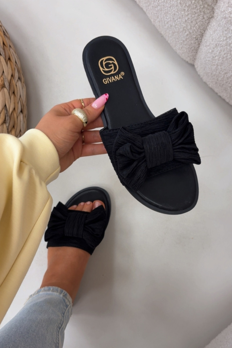 Zapatillas de mujer color negro con tacones anchos y moños Amivelle