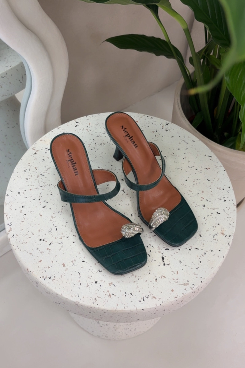 Zapatillas de mujer color verde botella con tacones delgados y detalles decorativos Lorissa