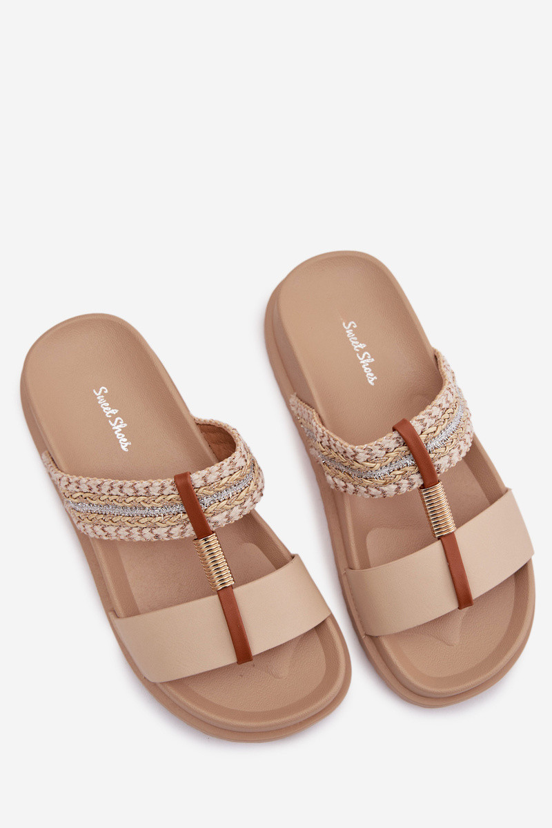 Pantuflas para mujer con plataforma y tiras con detalles dorados, color arena, Tahlia